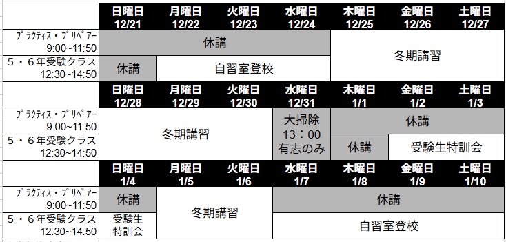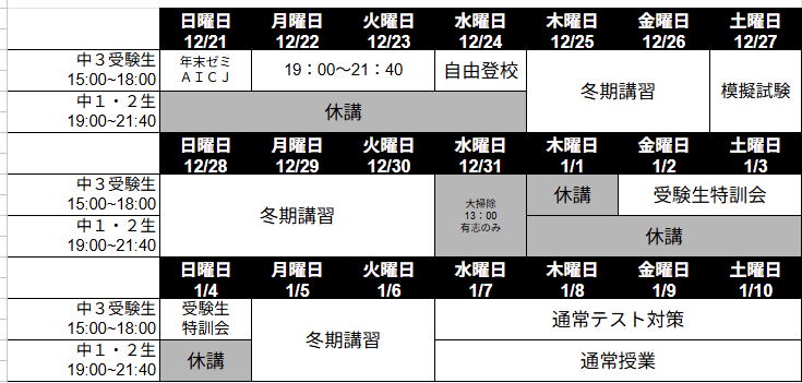 授業の時間帯は冬期講習で独立した内容を扱います。